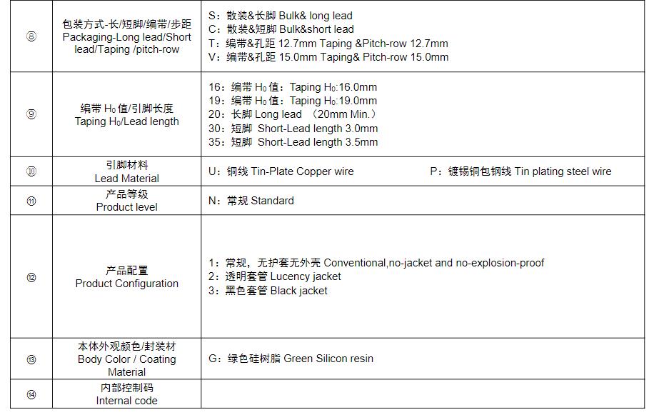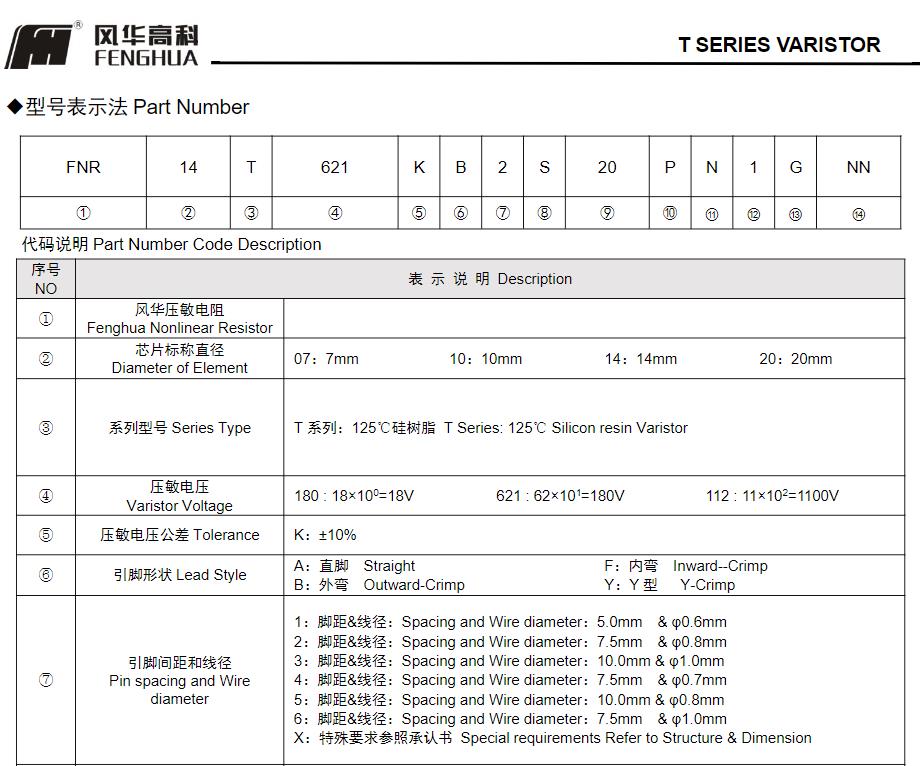 風華高科T系列壓敏電阻器型號命名規(guī)則: