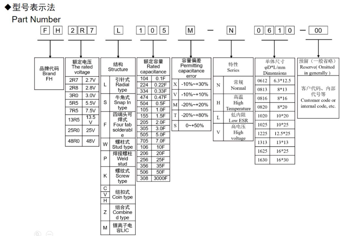 風(fēng)華高科高壓系列圓柱型超級電容器型號命名規(guī)則: