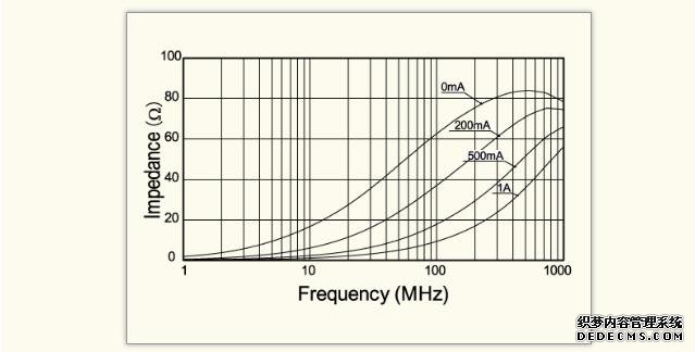 圖1是電流通過片狀鐵氧體磁珠時(shí)的阻抗值的變化示例。