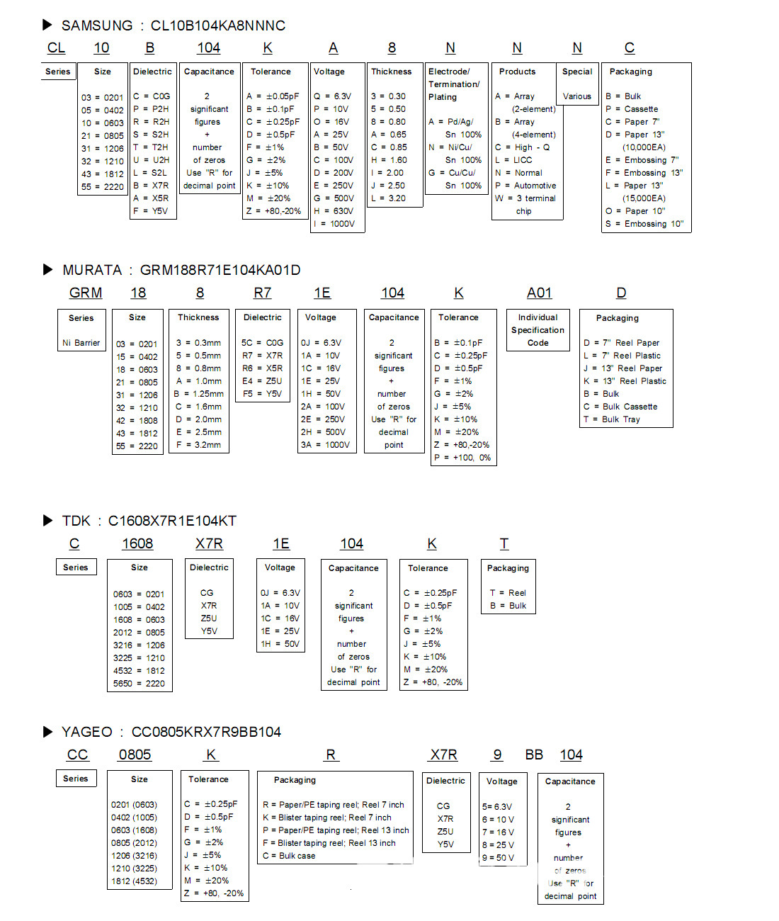 貼片電容的命名所包含的參數有貼片電容的尺寸、貼片電容用的材質、要求達到的精度、要求的電壓、要求的容量、端頭的要求以及包裝的要求。一般訂購貼片電容需提供的參數要有尺寸的大小、要求的精度、電壓的要求、容量值、以及要求的品牌。生產廠家都會在料盤上貼上這些參數,每顆物料一般都有型號,可以通過型號就能知道里面的貼片電容參數,每個廠商的貼片電容命名都不一樣,今天超翔小編就來講解下各大廠商貼片電容型號命名規則。