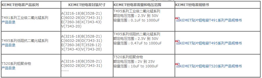 基美(KEMET)是貼片電容和鉭電容的生產(chǎn)商,基美鉭電容的銷售量位居全球第一,基美鉭電容由首字母“T”標(biāo)明,其后面為一個(gè)獨(dú)有的系列號(hào),如;T491,T492,主要常用的系列有T491,T492,T494,T495,T496,T510,T520,T530等。每個(gè)系列都表示一種共有的物理形式和封裝類型,以及同樣的尺寸范圍和在25℃、50%的相對(duì)濕度及一個(gè)大氣壓的標(biāo)準(zhǔn)條件下的某些特征。其中T491系列已經(jīng)增加了物種超薄外殼尺寸,R/2012-12,S/3216-12,T/3528-12,U/6032-15和V/7343-20。