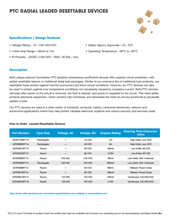 1、磚微型表面貼裝保險絲 2、薄型表面貼裝芯片保險絲 3、薄型SMD可復(fù)位器件 4、徑向PTC自恢復(fù)設(shè)備 5、250/277/350伏徑向保險絲 6、預(yù)制600V徑向保險絲 7、微型軸向引線保險絲 8、玻璃和陶瓷保險絲
