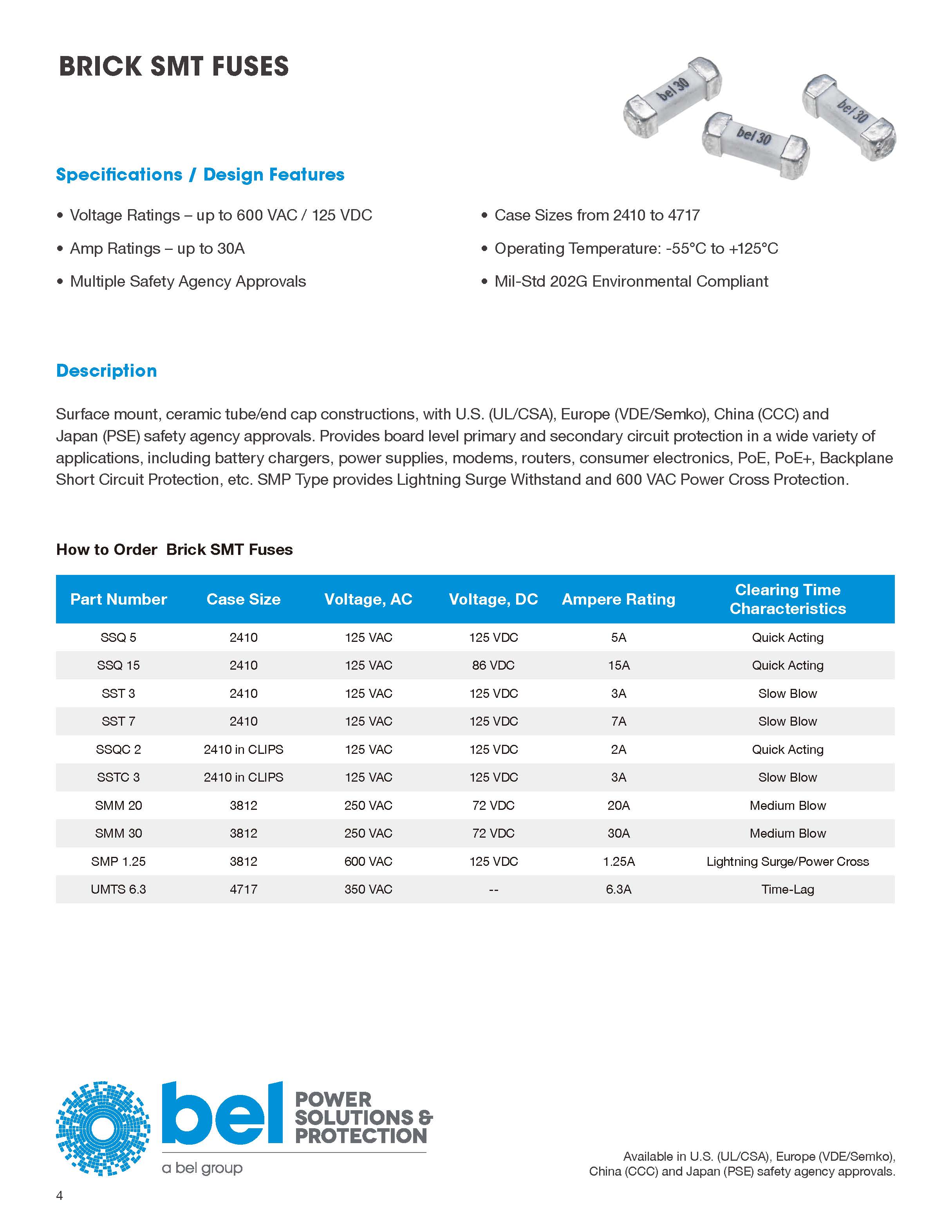 表面貼裝保險(xiǎn)絲 提供兩種類型的產(chǎn)品。陶瓷基板上的厚膜芯片技術(shù),具有0402、0603和1206的外殼尺寸,這是具有UL,CSA和CE認(rèn)證以及表面貼裝,“磚”式,陶瓷管/端蓋結(jié)構(gòu)的低成本解決方案。