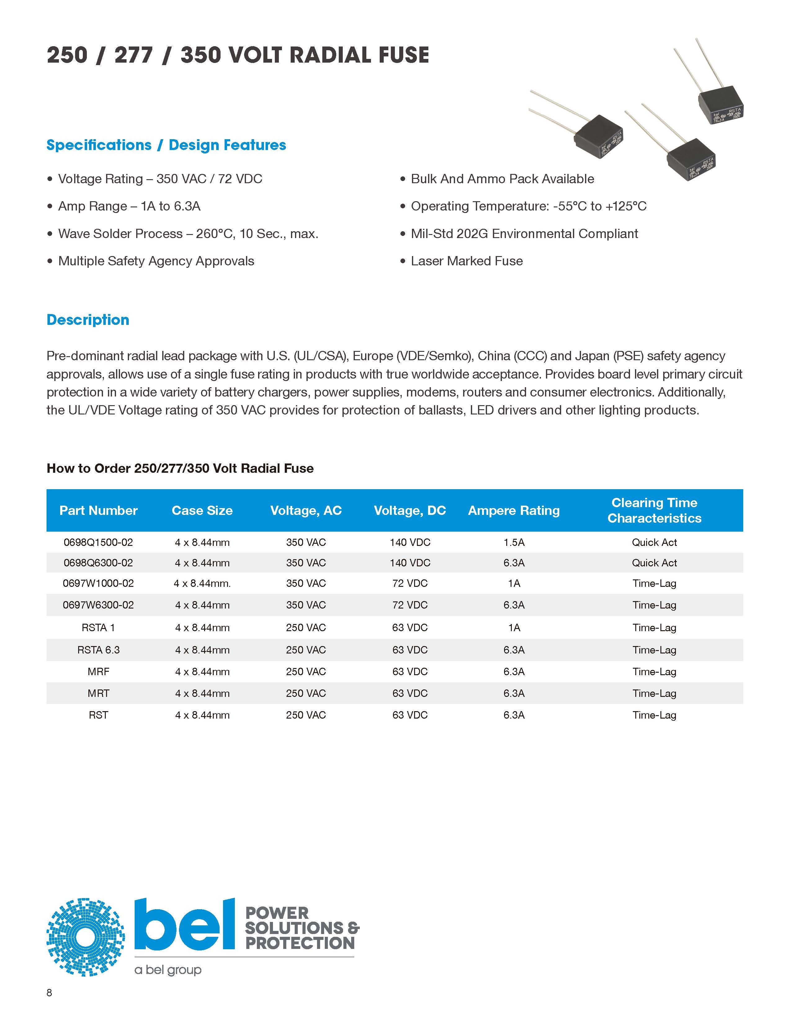 塑料主體和徑向引線保險絲 經(jīng)美國(UL / CSA),歐洲(VDE / Semko),中國(CCC)和日本(PSE)安全機(jī)構(gòu)批準(zhǔn),允許在真正被全球接受的產(chǎn)品中使用單個熔斷器額定值。在各種電池充電器,電源,調(diào)制解調(diào)器,路由器,消費類電子產(chǎn)品等中提供板級主電路保護(hù)。
