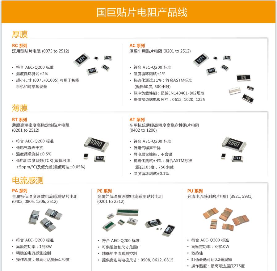 國(guó)巨貼片電阻:車用貼片電阻,電流感測(cè)微歐姆電阻,抗硫化貼片電阻,薄膜精密電阻,厚膜精密電阻,一般厚膜電阻,排阻與網(wǎng)絡(luò)排阻,高壓電阻