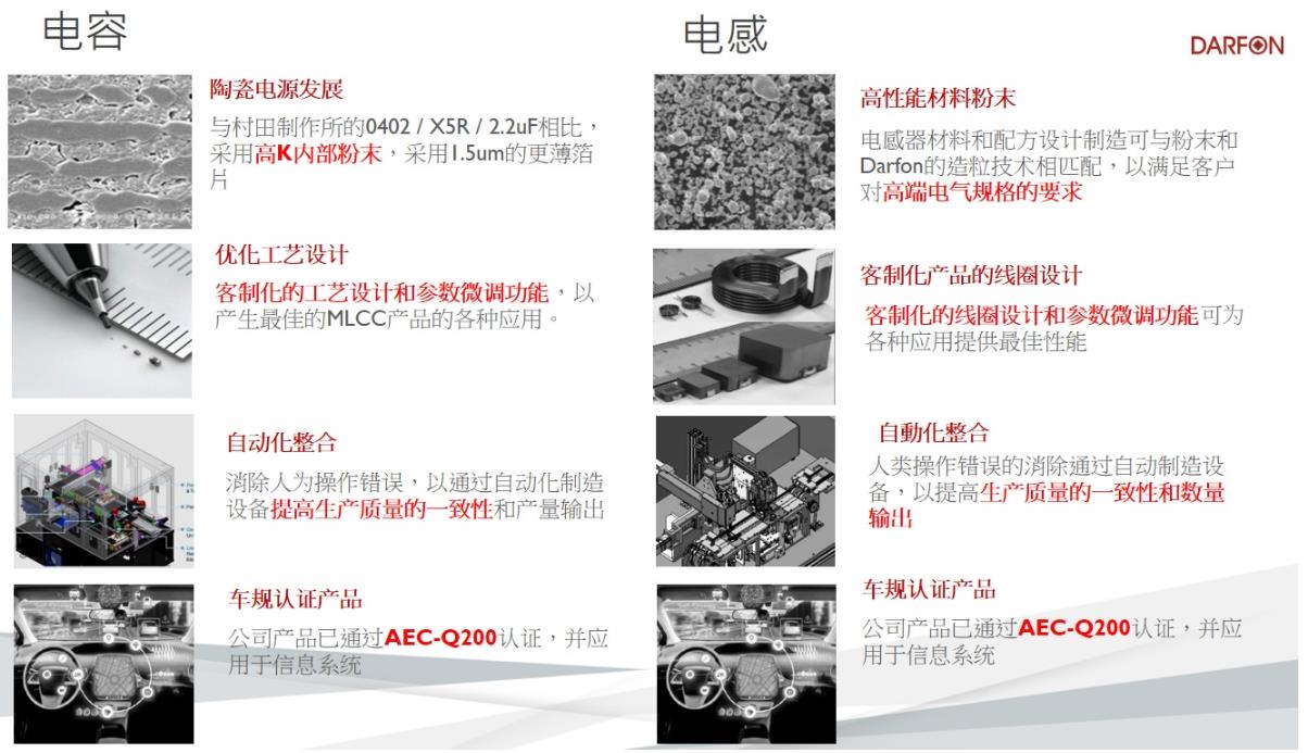 被動組件部分,達方著重運用先進材料以及增進高階粉末技術研發高信賴性產品,用于提升電氣特性以及高頻應用性能,并且促進良率及制程穩定度。達方目前為IT/工業/醫療/網絡通信/汽車產業提供高質量消費等級與車規產品被動組件以支持新應用技術開發。