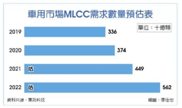 盡管消費(fèi)性產(chǎn)品需求轉(zhuǎn)弱,但自第三季起至今,汽車市場(chǎng)維持強(qiáng)勁的需求,成為供應(yīng)商在新產(chǎn)品規(guī)劃與產(chǎn)能擴(kuò)增的重點(diǎn)方向。預(yù)估2021、2022年車用MLCC需求將上看4,490億顆、5,620億顆,年增率將達(dá)20%、25%。