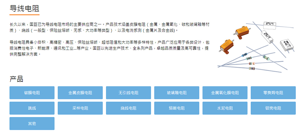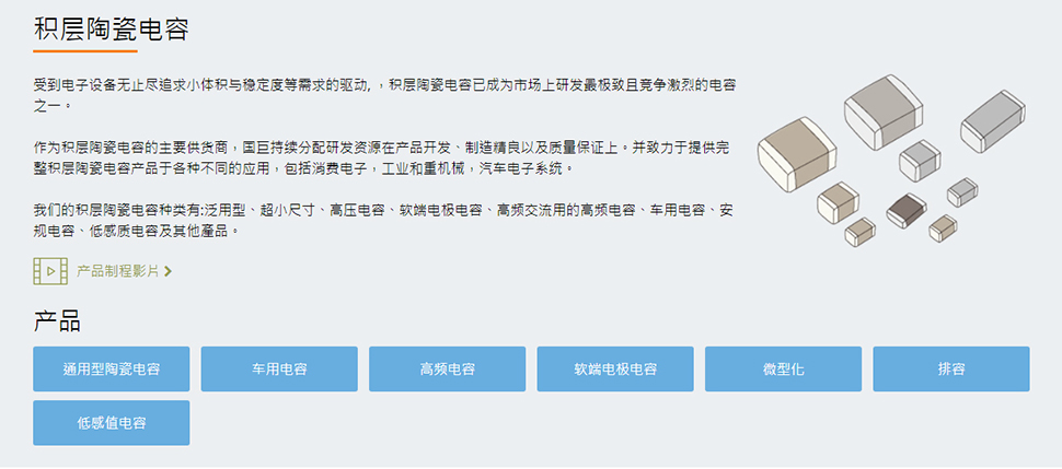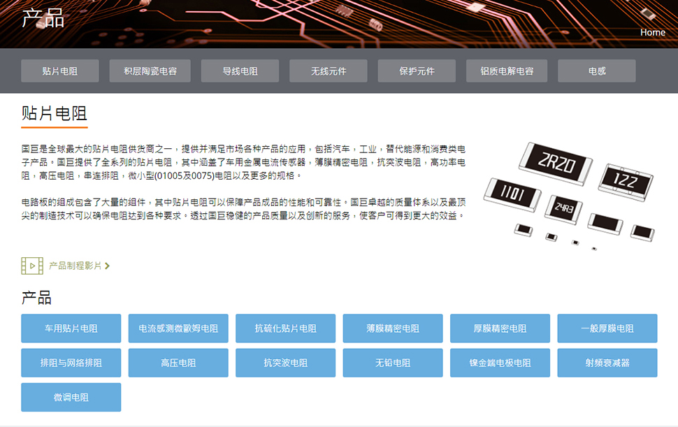 作為提供「一次購足服務(wù)」的大型被動(dòng)組件供貨商,國巨提供完整的產(chǎn)品線,包括芯片電阻、積層陶瓷電容、導(dǎo)線電阻、無線組件、鋁質(zhì)電解電容和電感。國巨的多元化產(chǎn)品皆針對主要的垂直市場研發(fā),包括手機(jī)、平板計(jì)算機(jī)、網(wǎng)絡(luò)、家電、工業(yè)/電力、再生能源、醫(yī)療和汽車應(yīng)用。