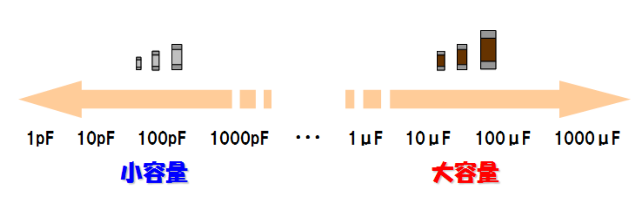 什么是電容的靜電容量?靜電容量是表示電容器的蓄電能力的物理單位,以F(法拉)為單位表示。在陶瓷電容器使用的范疇里內,F單位已經過大,因此常使用μF(微法、法拉的100萬分之一)、pF(皮法、法拉的1兆分之1)單位。根據使用的地方、狀況的不同,基準也不同,但陶瓷電容器在1μF以上時就稱為大容量,低于1000pF時稱為小容量。