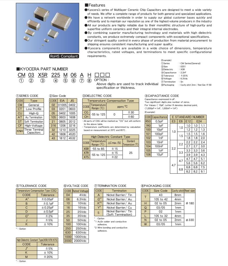 Kyocera 自 1990 年以來便屬于 Kyocera Group 集團,也是 Kyocera Electronic Devices 的授權供應商。 Kyocera Corporation 成立于 1959 年,總部設在日本京都,是連接器、電容器、陶瓷諧振器、表面聲波 (SAW) 濾波器、雙工器、晶體振蕩器以及定時器件領域的全球領先制造商和供應商。Kyocera 京瓷貼片電容命名規則: