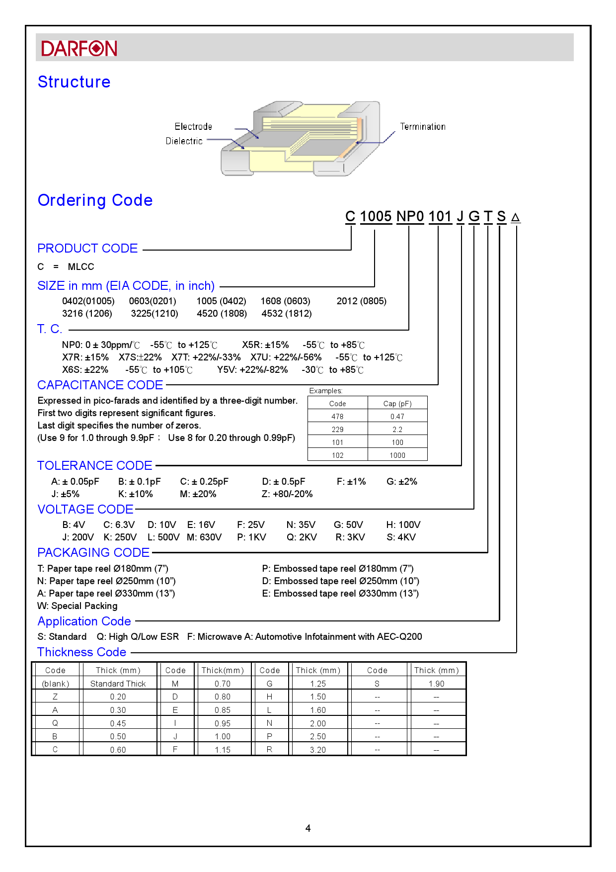 DARFON(達方)貼片電容命名規則: 例如:達方電容型號:C 1005 NP0101JGTS△產品代碼:C = MLCC陶瓷電容器1005=尺寸:0402(01005) 0603(0201) 1005 (0402) 1608 (0603) 2012 (0805) 3216 (1206) 3225(121