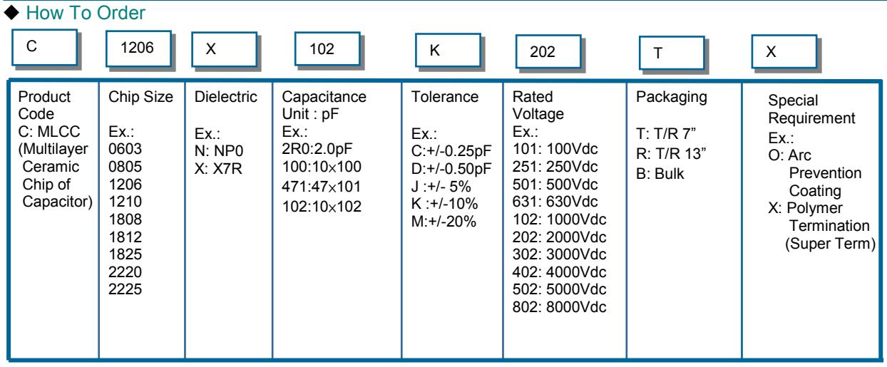 禾伸堂貼片電容命名規則:例如:禾伸堂電容型號:C1206X102K202TX C=多層陶瓷電容器 1206尺寸=0603 0805 1206 1210 1808 1812 1825 2220 X材質=N:NPO X:X7R 102容量=2R0:2.0PF 10X100 471:47X10