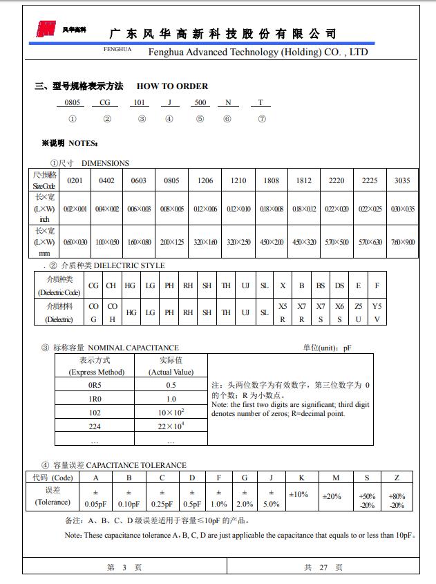 風華電容規格書對照表:風華電容型號編碼規則: 1、風華電容封裝尺寸:0201.0402.0603.0805.1206.1210.1808.2220.2225.3035 2、風華電容介質種類:常用CG(COG或NPO)、B(X7R)、F(Y5V)、X(X5R)、E(Z5U) 3、標稱容量代號(單位:NF): 104:標稱阻值為100NF,標稱容量采用E-24標準的三位數