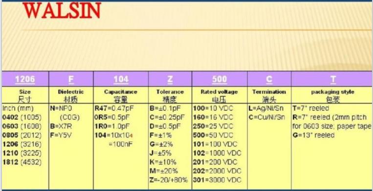 華新科貼片電容命名規則對照表,對于很多用戶有需要一份華新科電容對照表,華新科walsin品牌在電子元器件也是知名品牌之一,被很多廠家所熟知,超翔電子專業銷售華新科電容,華新科電阻等一系列華新科產品,型號規格齊全,現貨庫存,價格合理,歡迎咨詢合作! 下面是華新科電容命名規則圖:供大家參考: 華新科貼片電容命名規則:例如型號:1206 B 104 K 500 C T1206尺寸英寸