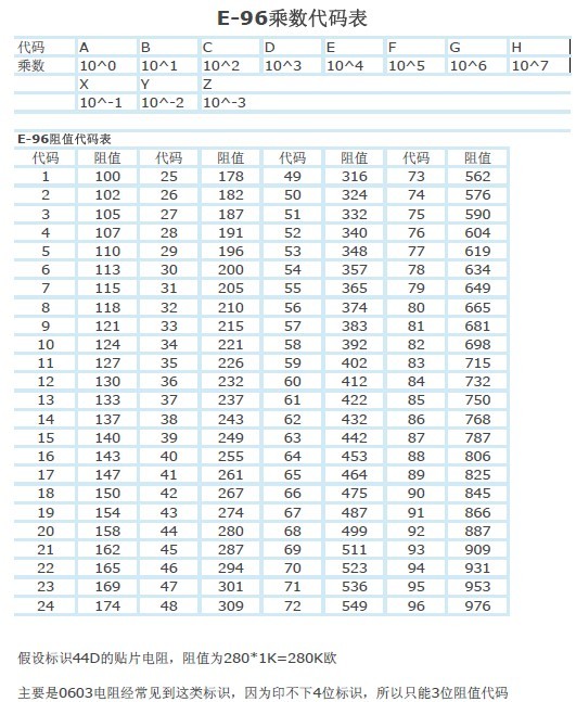 貼片電阻阻值對照表